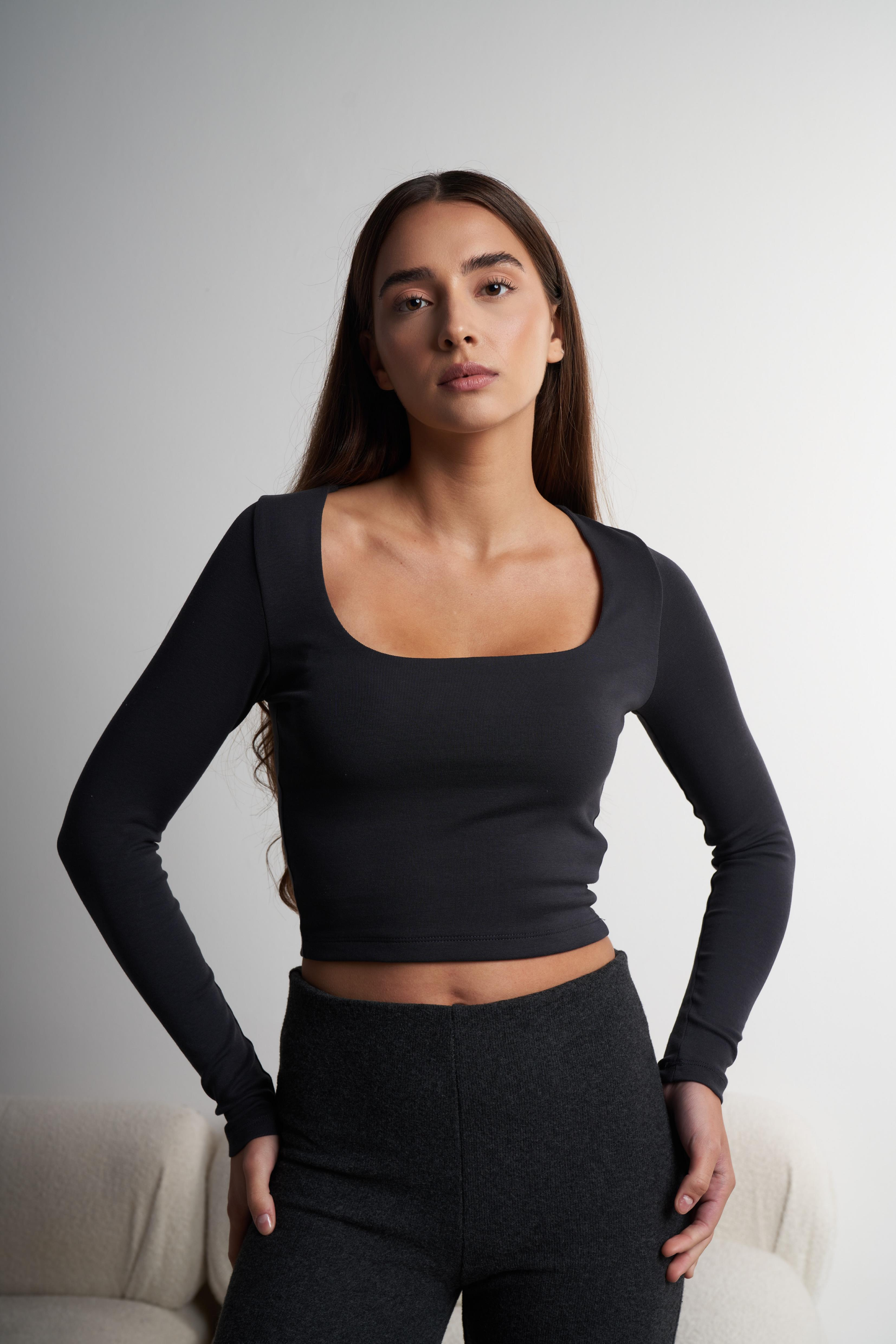 Füme Kompak Kumaş Likralı H Yaka Basic Kısa Bluz
