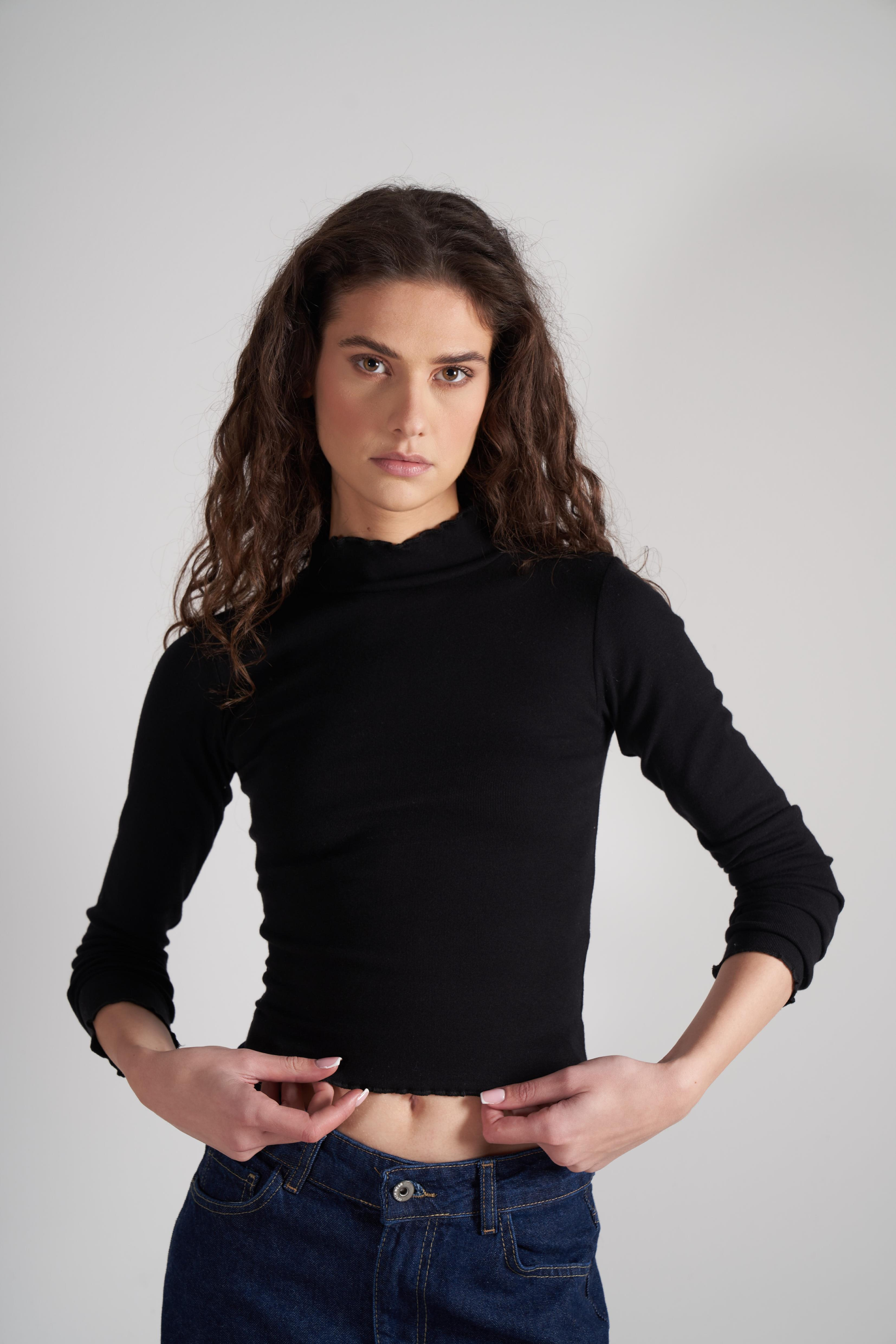 Dik Yaka Basic Uzun Kol Bluz Siyah