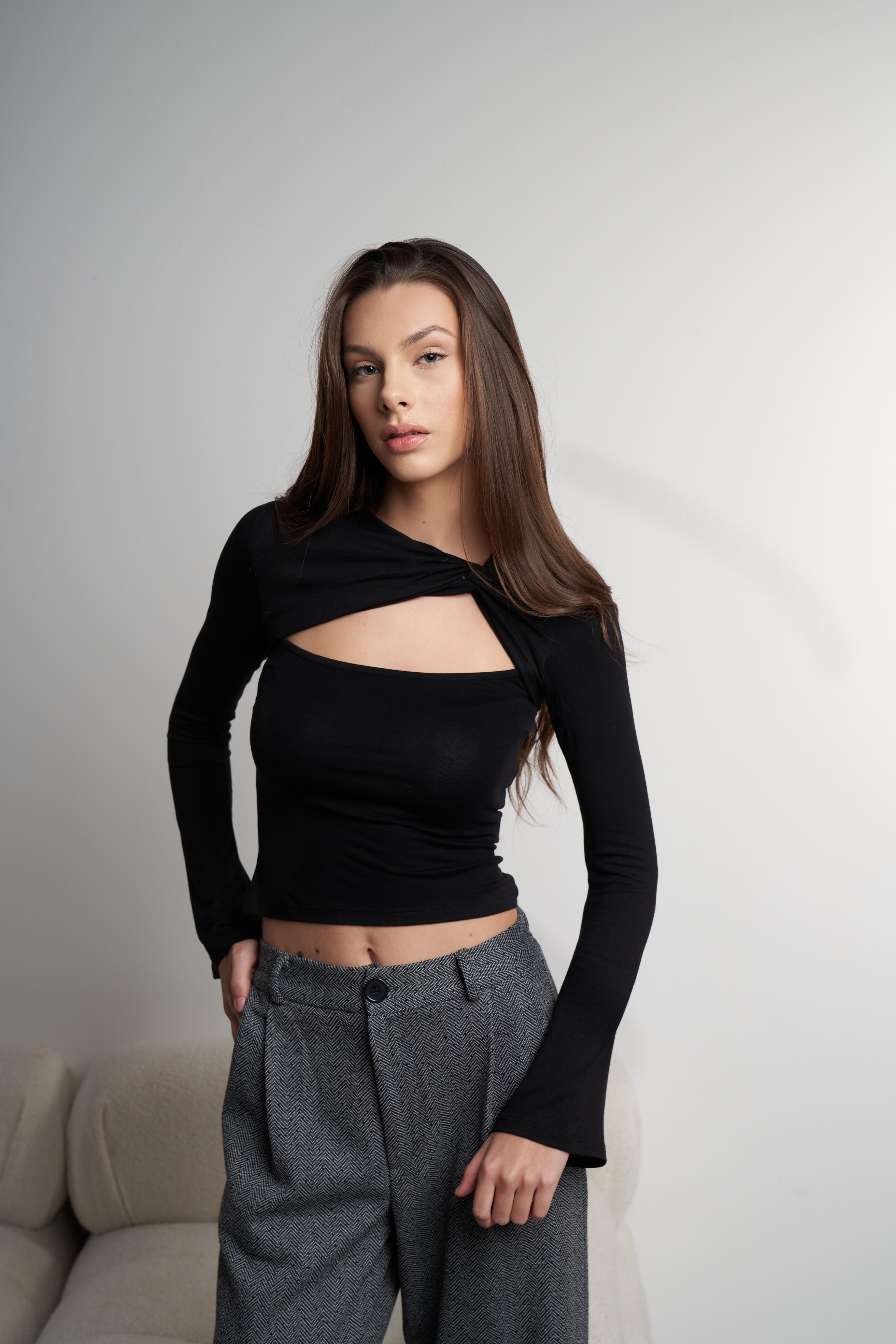 Siyah Bisiklet Yaka Ön Pencere Detaylı Sandy Kumaş Uzun Kol Bluz
