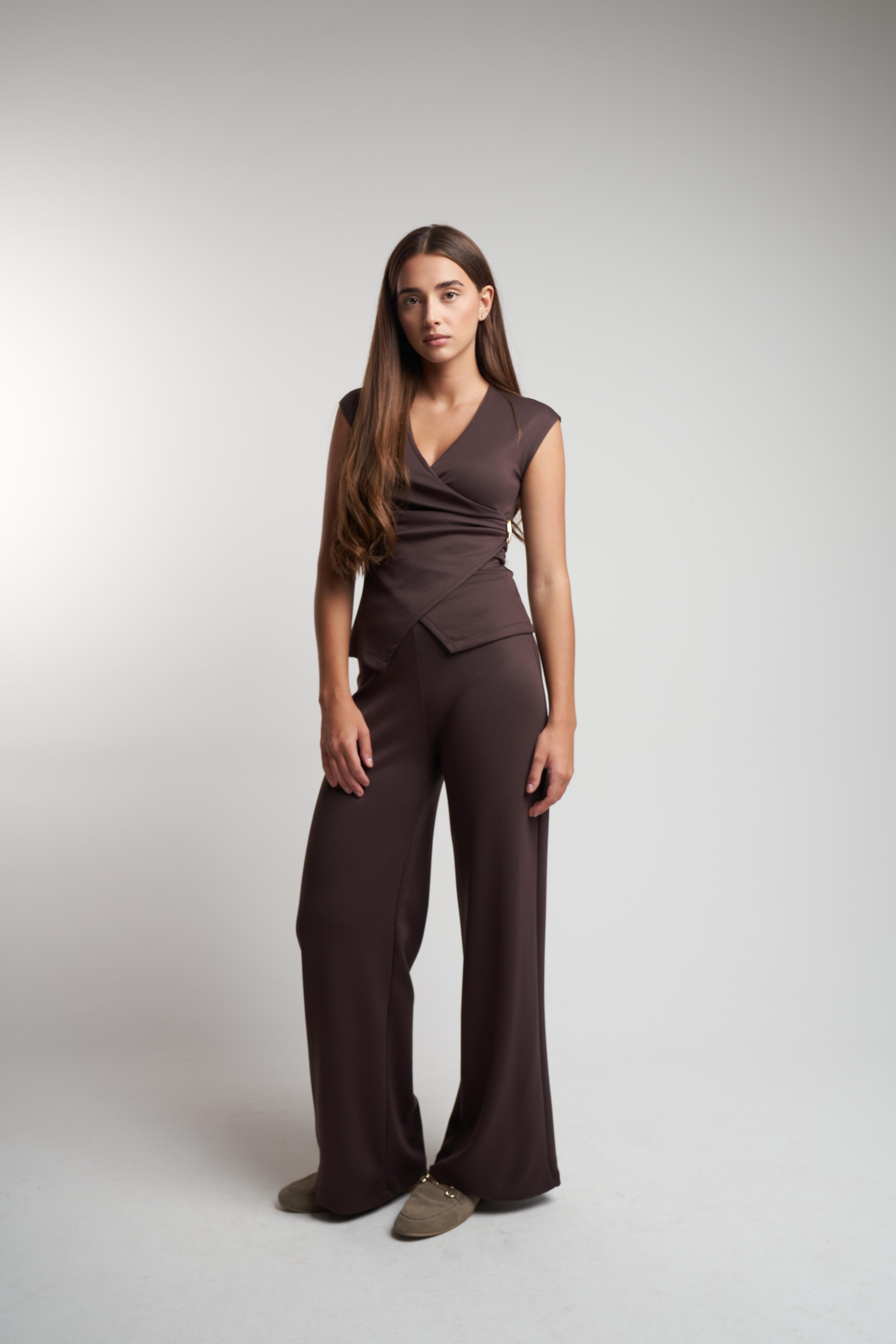 Bol Paça Pantolon Siyah Kruvaze Sıfır Kol Bluz Kahve Kruvaze Sıfır Kol Bluz Siyah