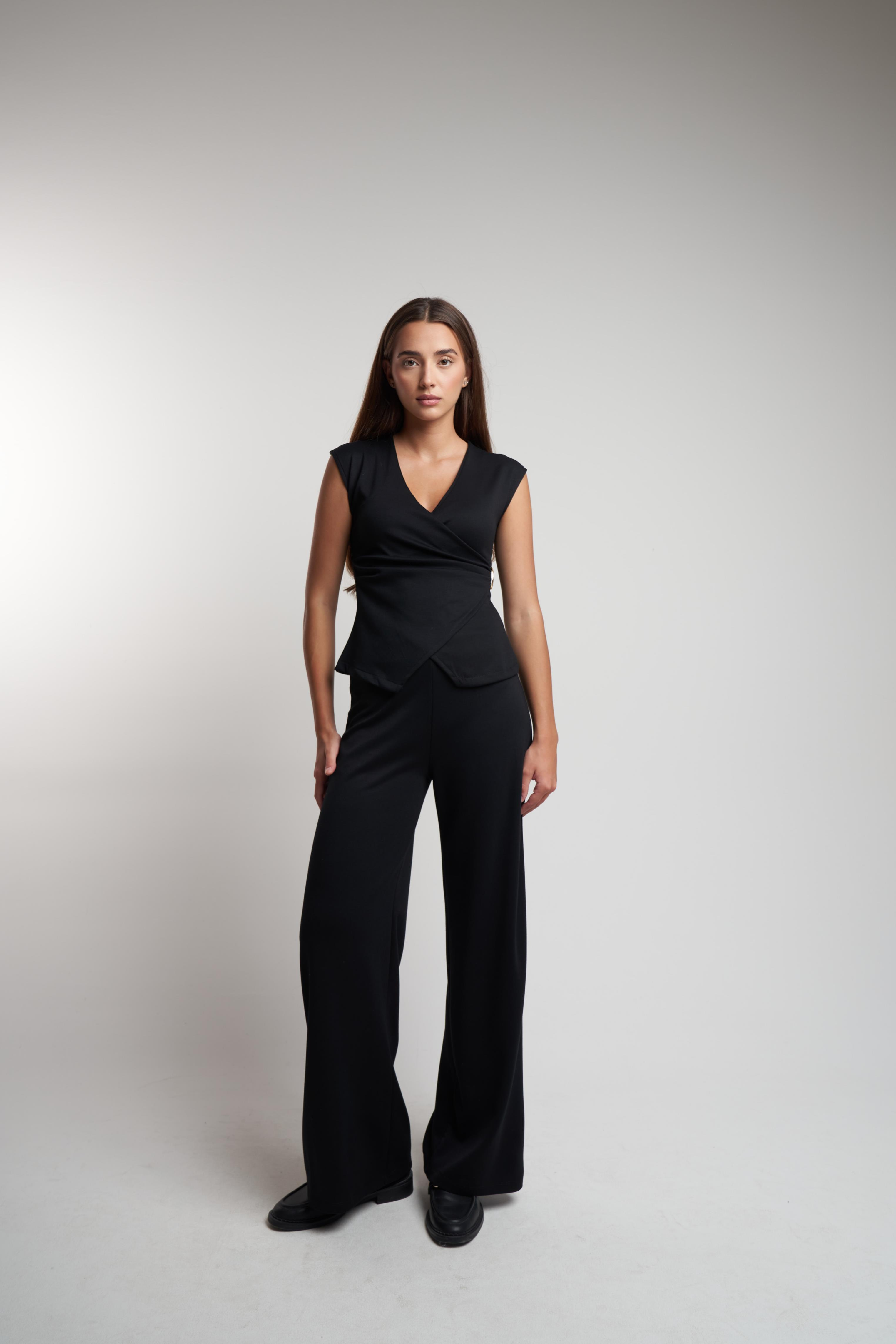 Bol Paça Pantolon Kahve Kruvaze Sıfır Kol Bluz Kahve Kruvaze Sıfır Kol Bluz Siyah