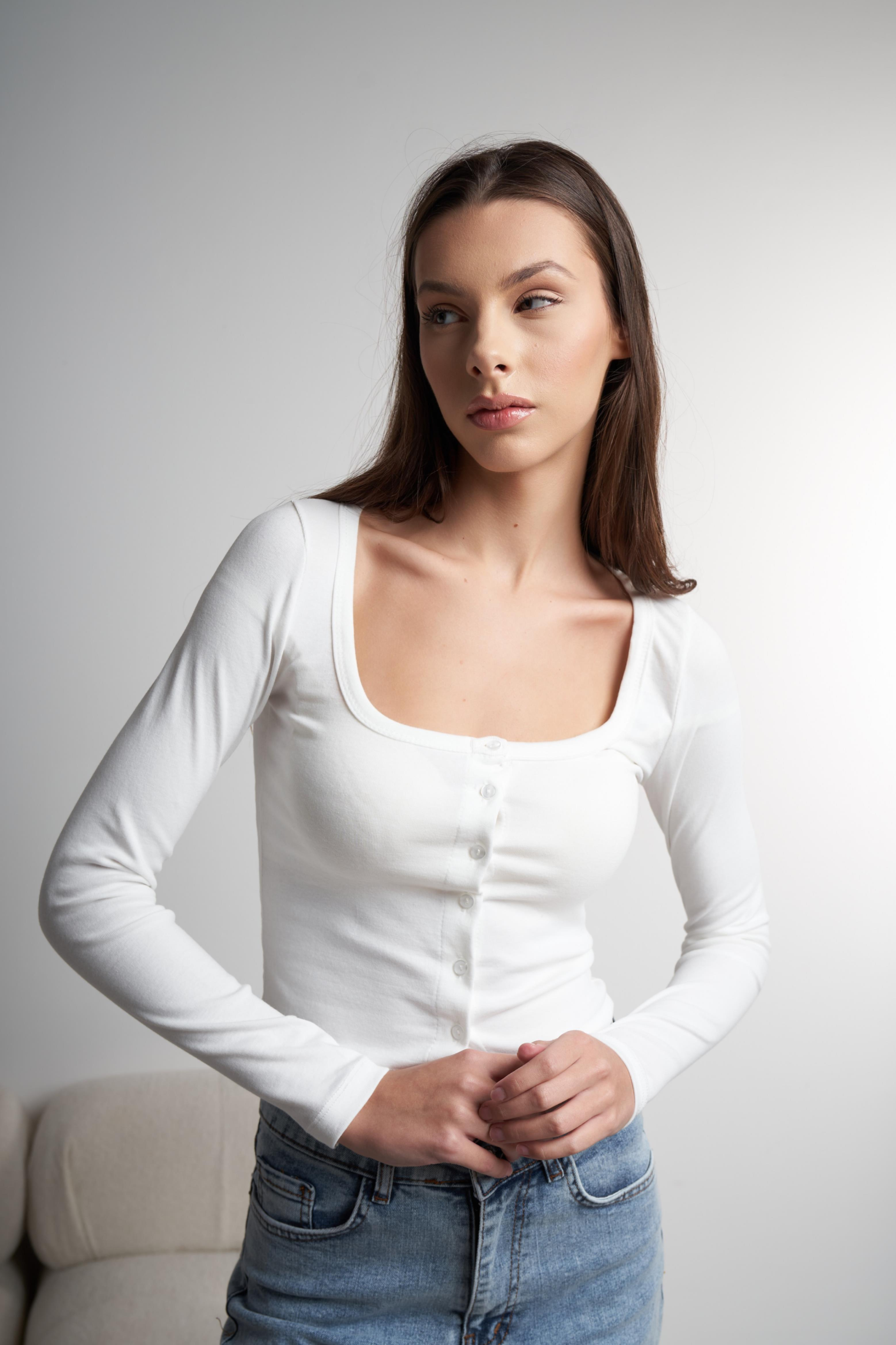 H Yaka Düğmeli Uzun Kol Bluz Ekru