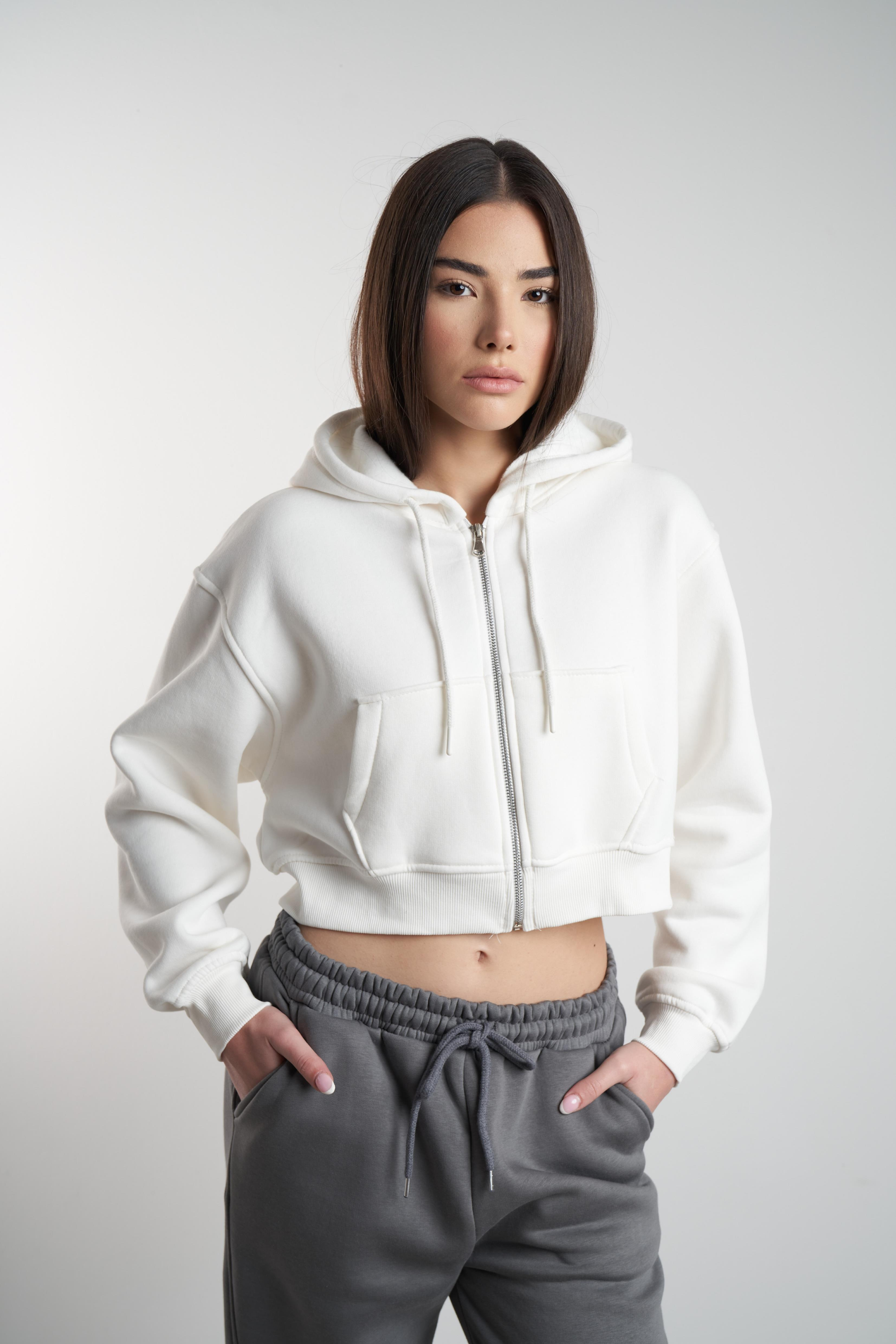 Kapüşonlu Kısa Sweatshirt Ceket Ekru