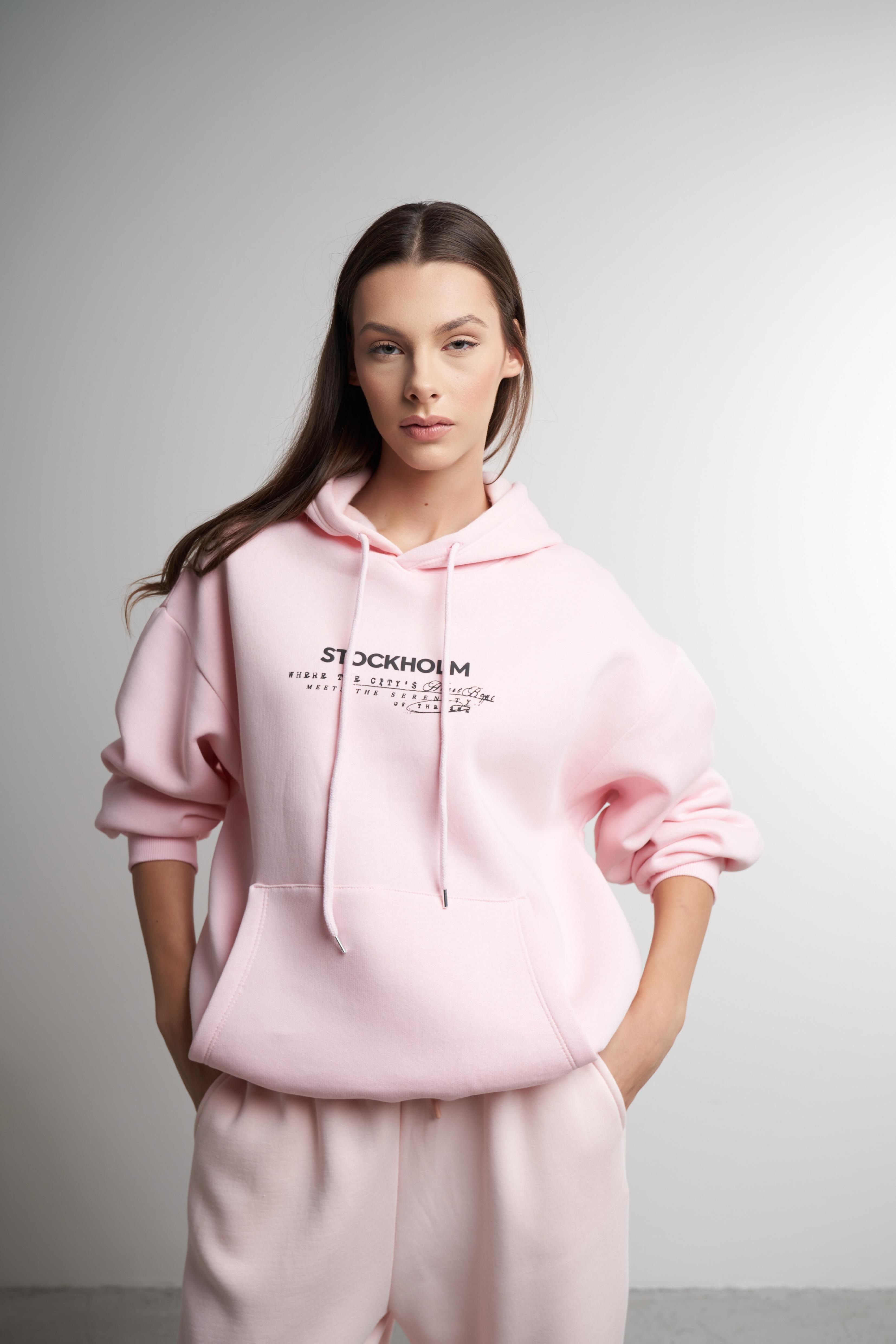 Kapüşonlu Stockholm Baskılı Sweatshirt Toz Pembe
