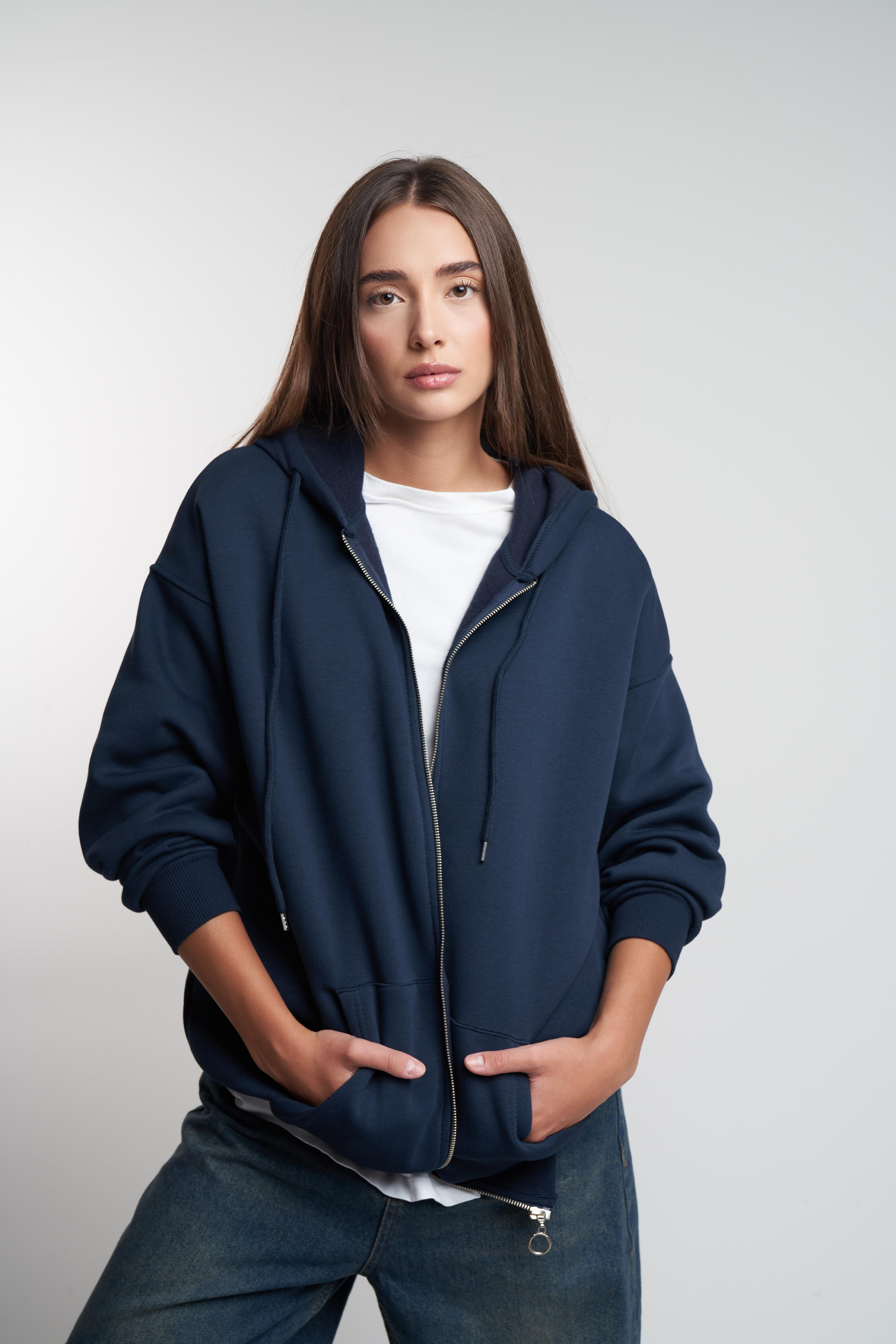 Basic Kapüşonlu Fermuarlı Cep Detaylı Uzun Kol Şardonlu Sweatmont Lacivert