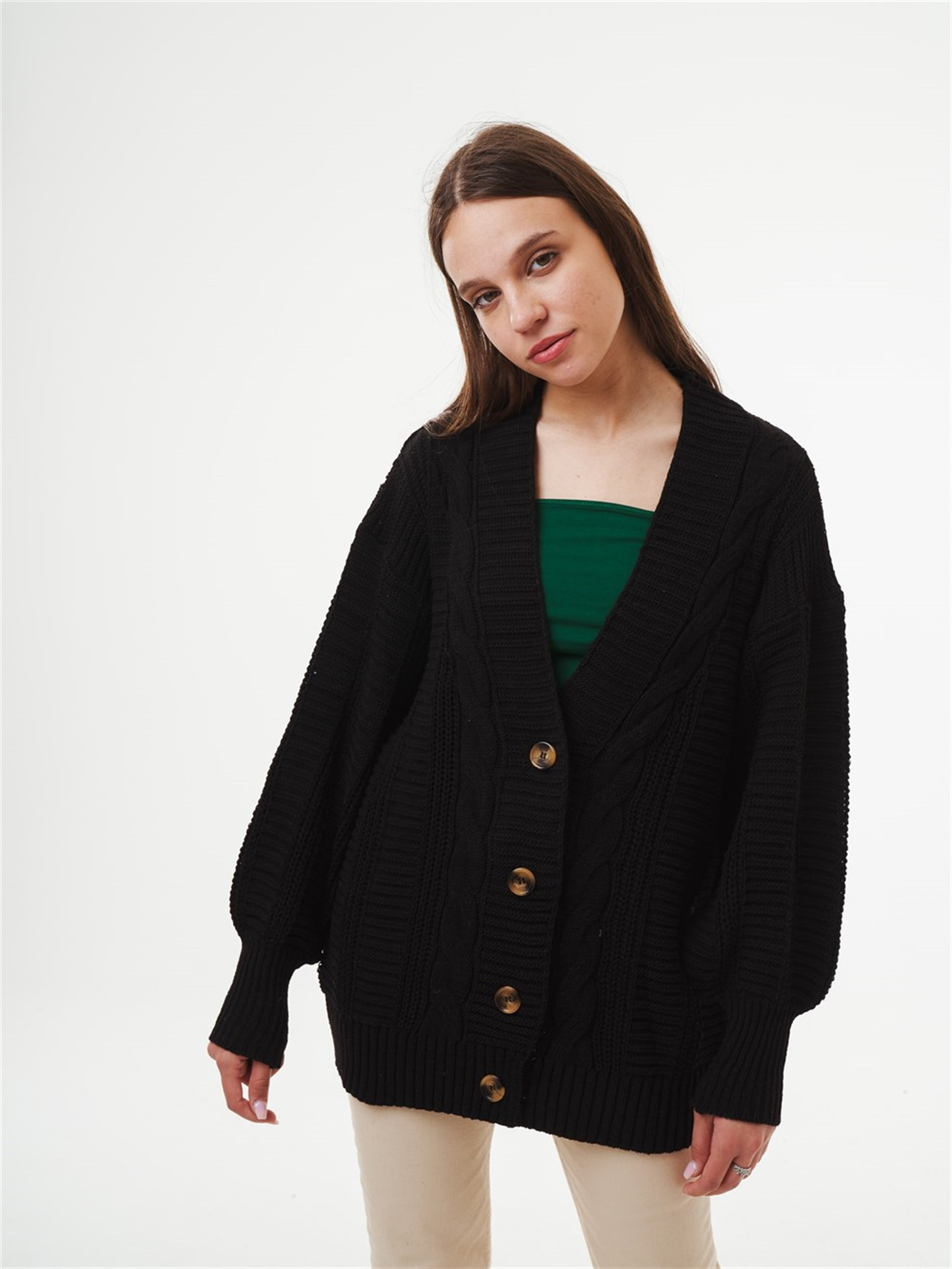 Siyah Saç Örgüsü Detaylı Uzun Örme Hırka