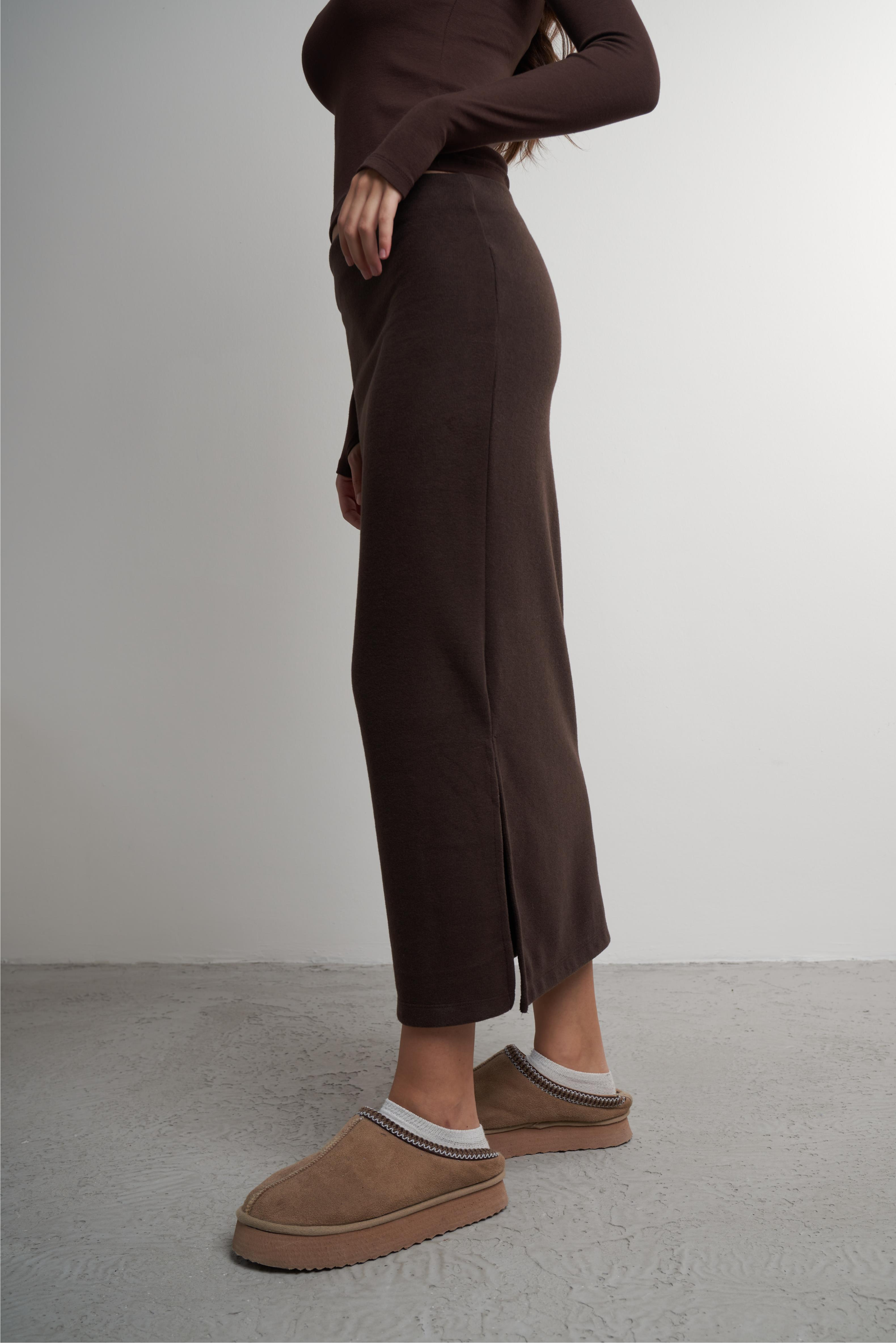 Bel İçi Lastik Sol Yırtmaç Detaylı Triko Uzun Etek Kahve