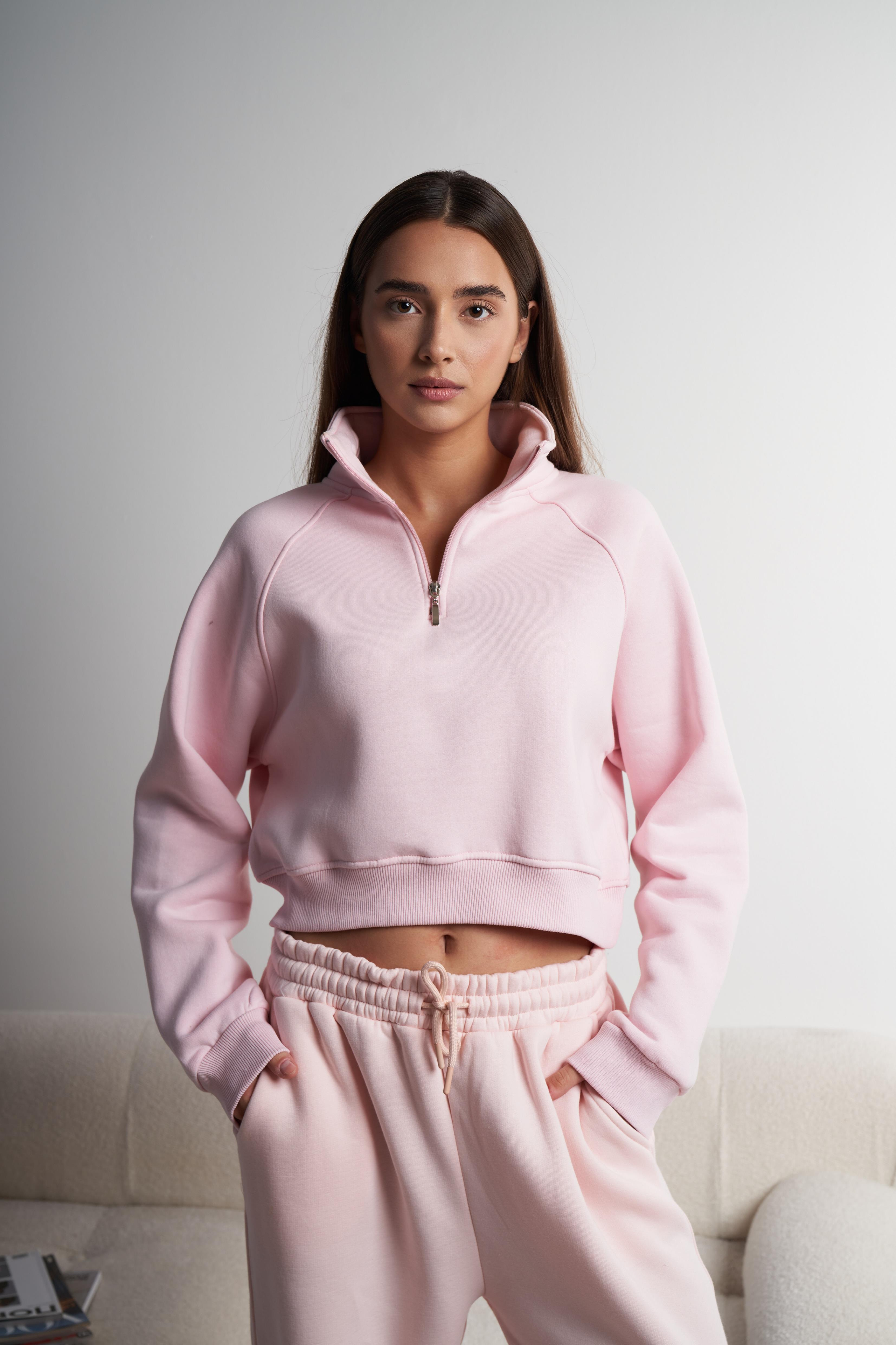 Yakalı Yarım Fermuarlı Şardonlu Kısa Sweatshirt Pembe