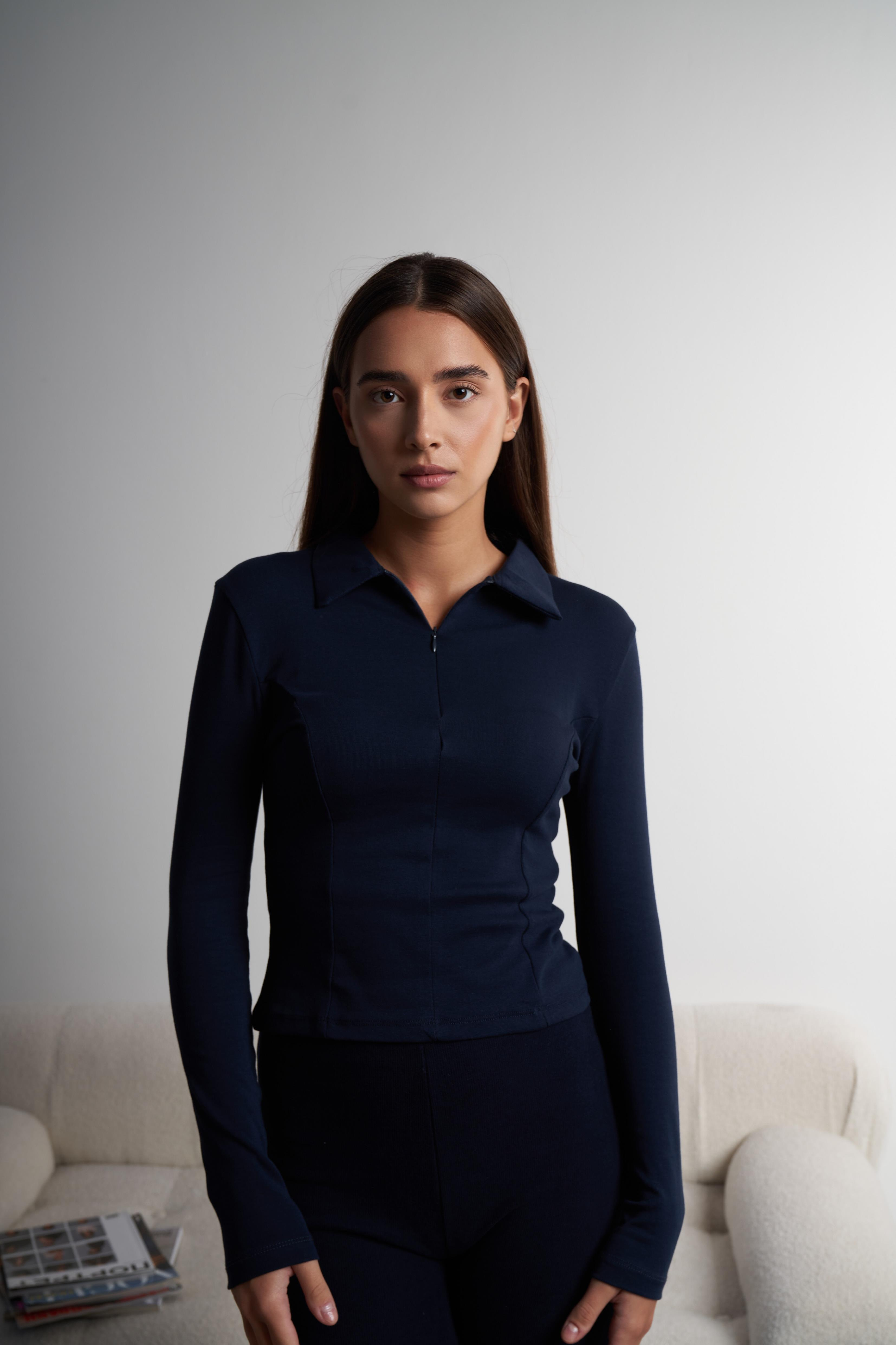 Yakalı Yarım Fermuar Detaylı Uzun Kol Bluz Lacivert