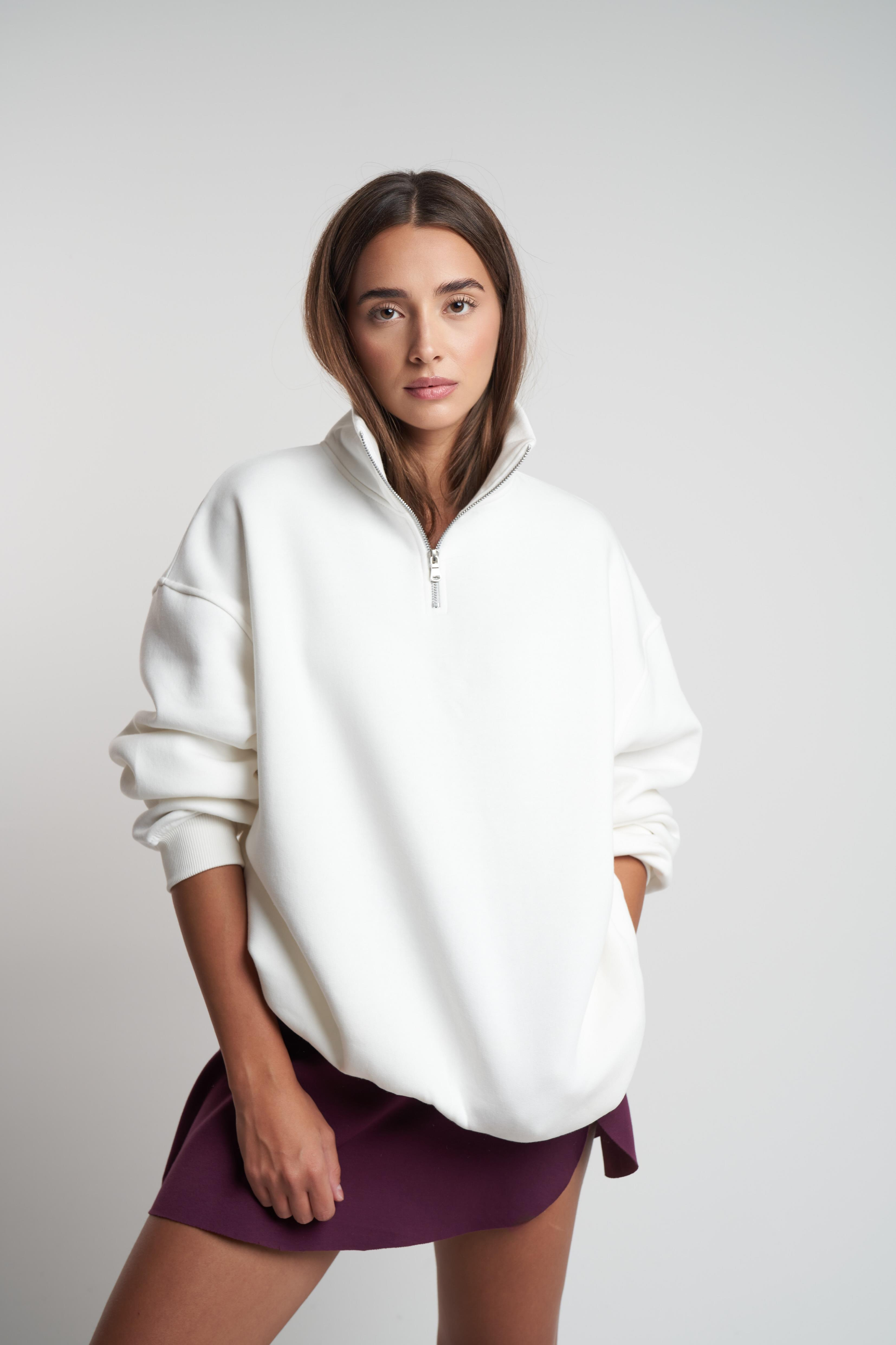 Yarım Fermuar Şardonlu Uzun Sweatshirt Ekru